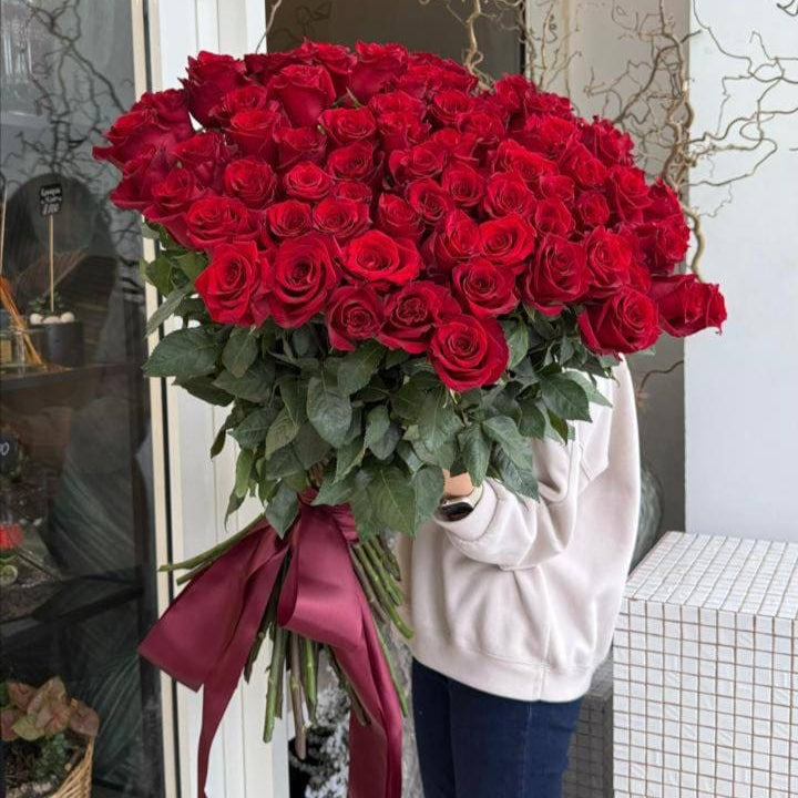 Шикарный букет из 51 метровой розы в ленту — впечатляющая и роскошная композиция, символ страсти, любви и изысканности. Масштабный размер и эффектная подача делают букет незабываемым подарком для особых событий и признаний. Быстрая доставка цветов по Астане позволит преподнести этот великолепный букет вовремя и порадовать получателя.