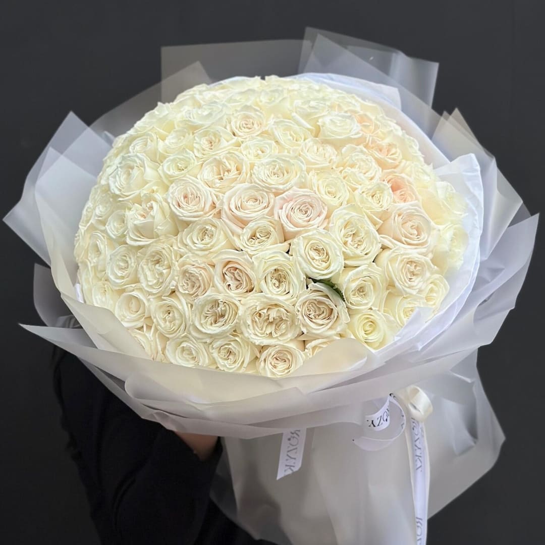 Роскошный букет из 101 белой розы — воплощение чистоты, искренности и возвышенных чувств. Масштабная композиция из белоснежных роз смотрится торжественно и благородно, подчёркивая особое значение момента. Такой подарок станет незабываемым символом любви и уважения, а доставка цветов по Астане позволит вручить его вовремя и сохранить всю торжественность момента.